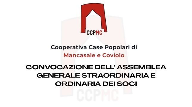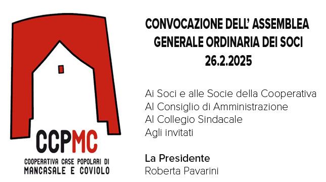 OGGETTO: CONVOCAZIONE DELL’ ASSEMBLEA GENERALE ORDINARIA DEI SOCI I Soci e le Socie, il Consiglio di Amministrazione e il Collegio Sindacale della Cooperativa Case Popolari Mancasale e Coviolo sono convocati all’Assemblea generale ordinaria…